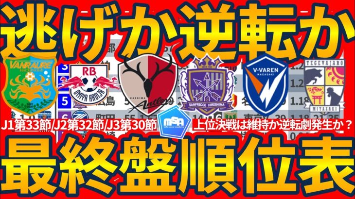 【最終盤戦順位表│J1第33節/J2第32節/J3第30節】J1では鹿島は神戸京都と連戦!!J2では水戸が次節千葉戦!!J3では八戸/栃木C逃げ切りか鹿児島宮崎FC大阪逆転か…優勝昇格残留レースの行方